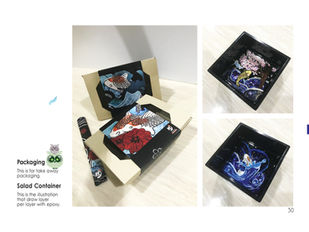 The packaging design for taking away service in the restaurant. The hand painting Japanese plates for appetizer use.